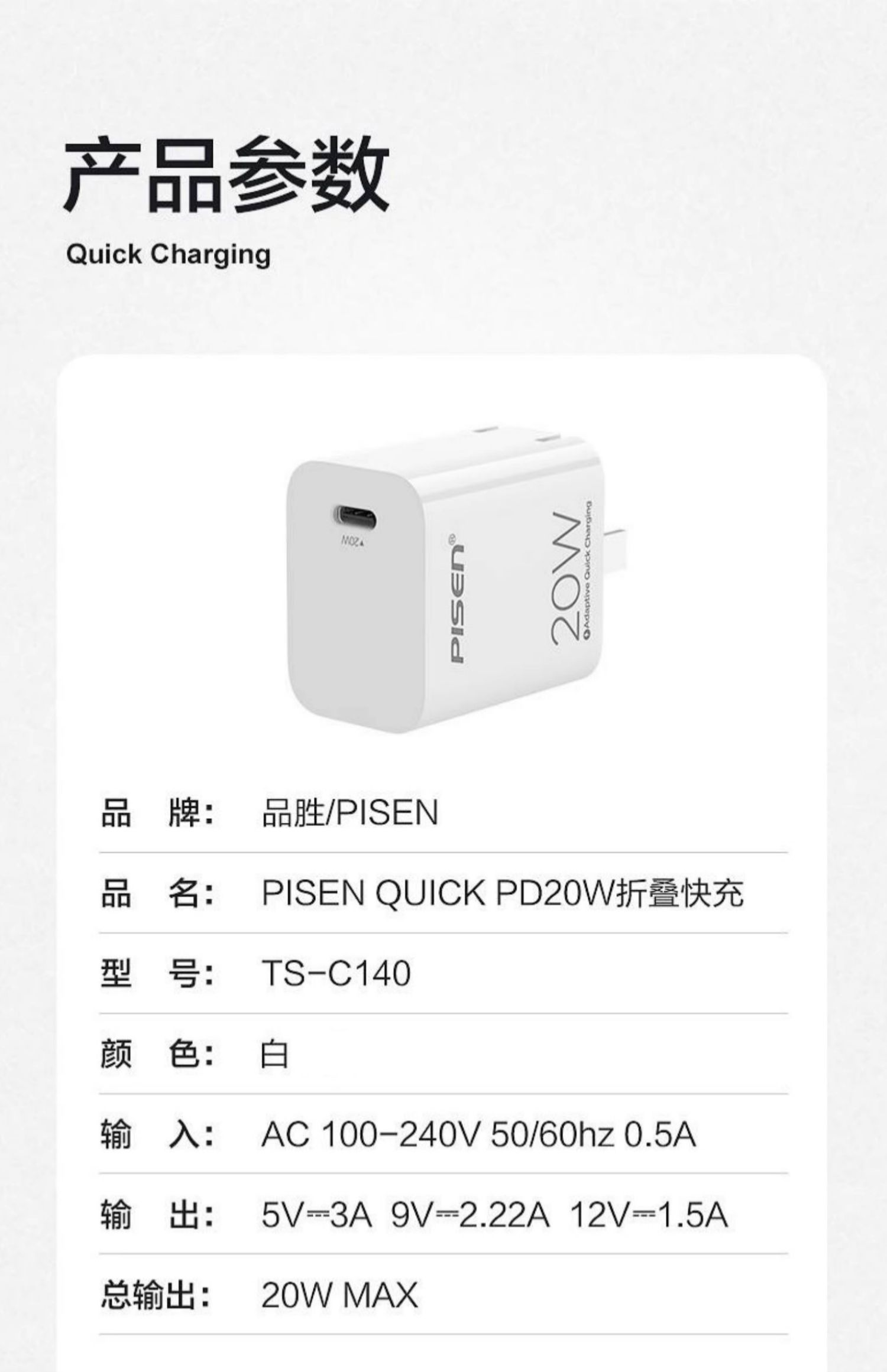 品胜TS-C140 折叠 PD20W充电头