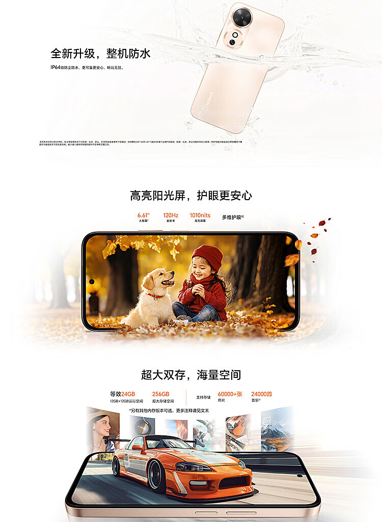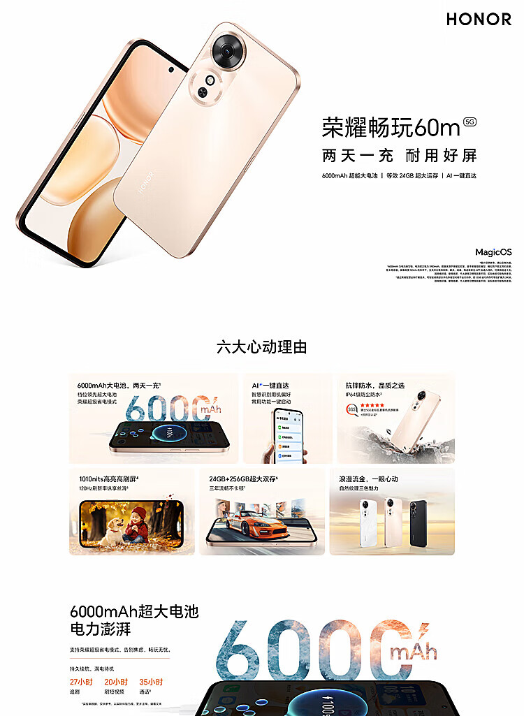 荣耀(HONOR)畅玩60m 6000毫安长续航120Hz护眼高刷屏IP64抗摔防水新品5G手机 墨岩黑 5G全网通 8G+256GB