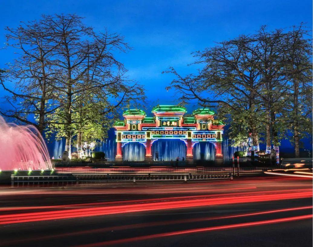 【七星岩牌坊】彩色梦幻音乐喷泉与七星岩牌坊相映成趣历史建筑的雅韵与闪亮地标相融交集为端城
